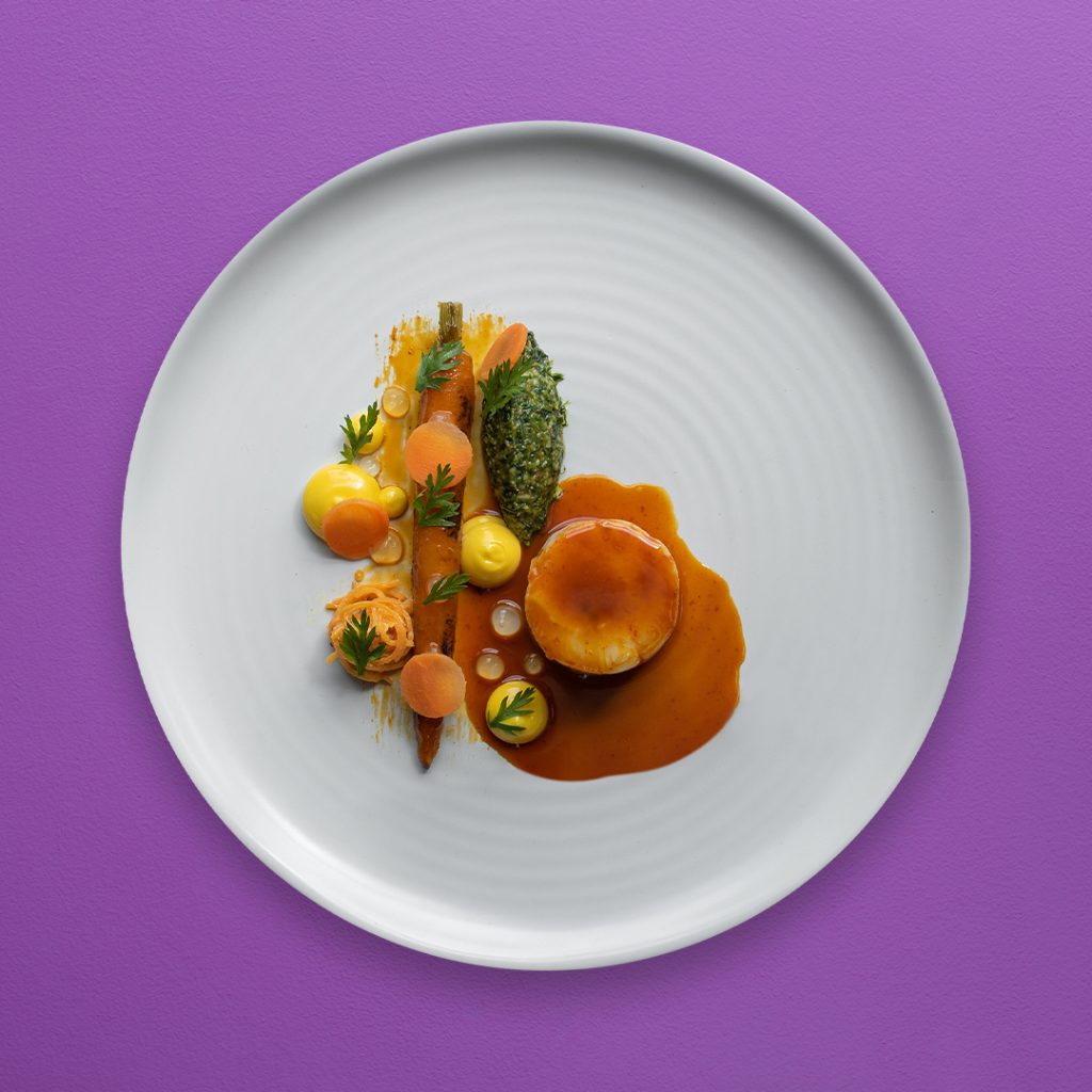 · “Dip Face, Have a Carrot” – Matilda – Sole Ballotine, Tandoori Baked Carrot, Carrot Top Pesto, Lobster Jus