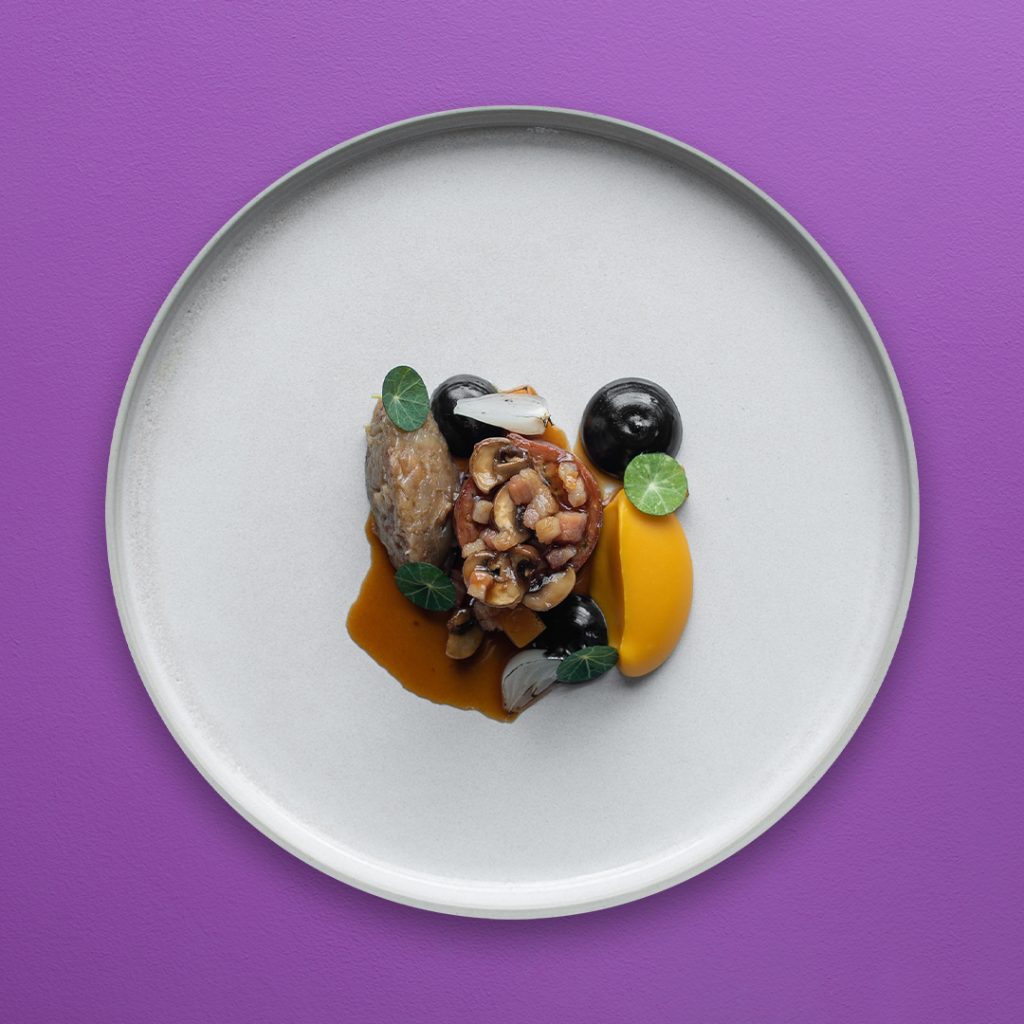 · Three Little Pigs – James Halliwell-Phillips – Pork Roulade, Pumpkin, Sweet & Sour Choucroute, Smoked Ash Emulsion, Bourguignon Jus
