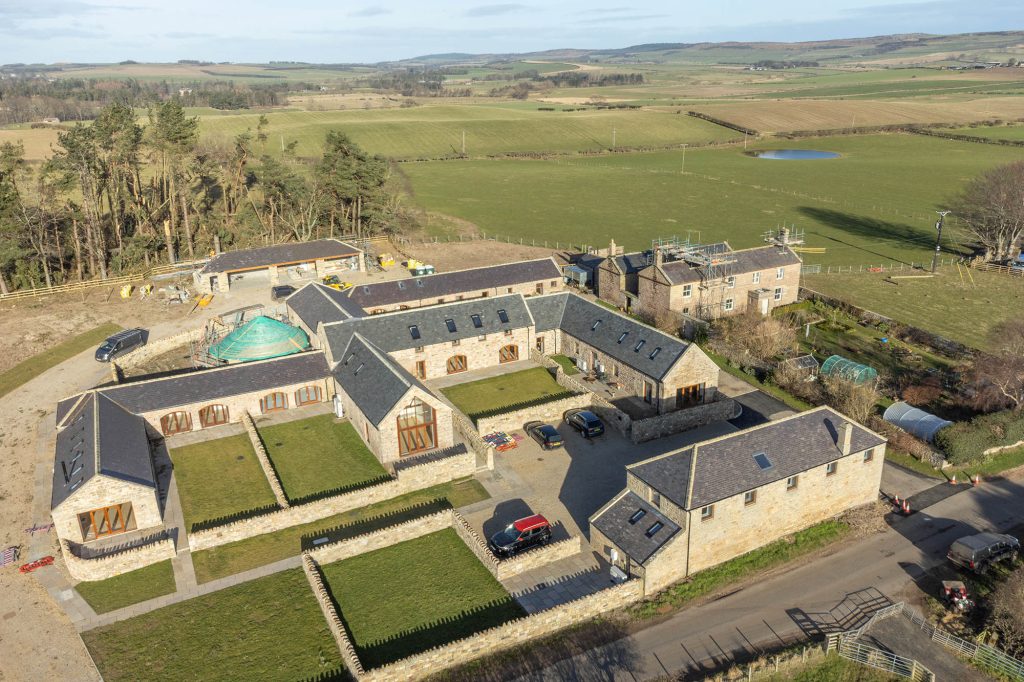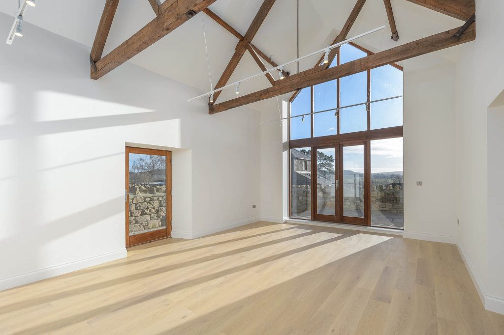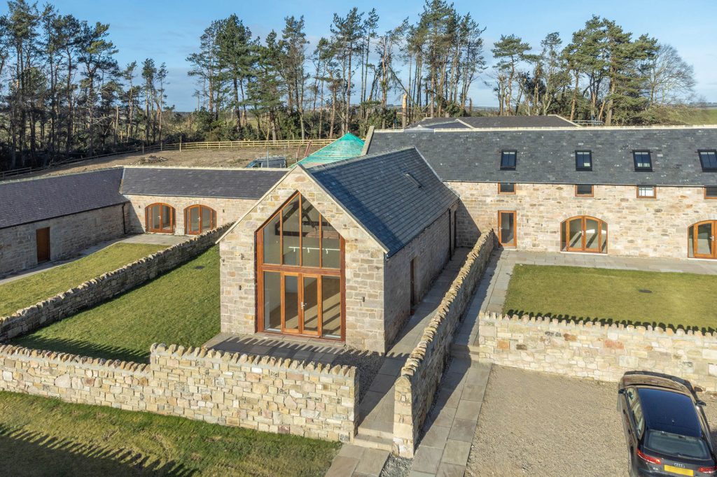 The property is accessed into a central entrance hall although the ground floor bedrooms and living area also benefit from access doors. The kitchen and living area are open plan with high quality kitchen installed with an arrange of units, integrated appliances and sleek worktop. The living area benefits from a full height glazed gable end perfectly framing the gorgeous Northumberland countryside, whilst the original beams retain a period country feel inside. To the rear of the ground floor there is a utility room, W/C, stores and stairs next to the hallway in addition to two double bedrooms each of which benefit from French doors leading onto the garden. One of the bedrooms is further enhanced from en-suite shower.