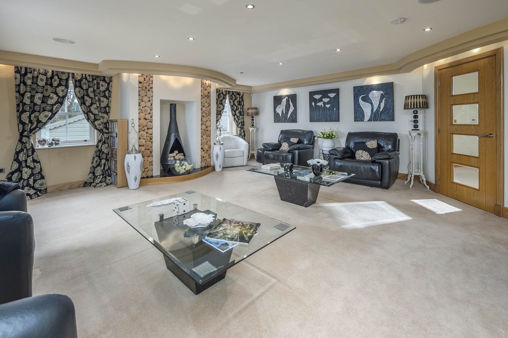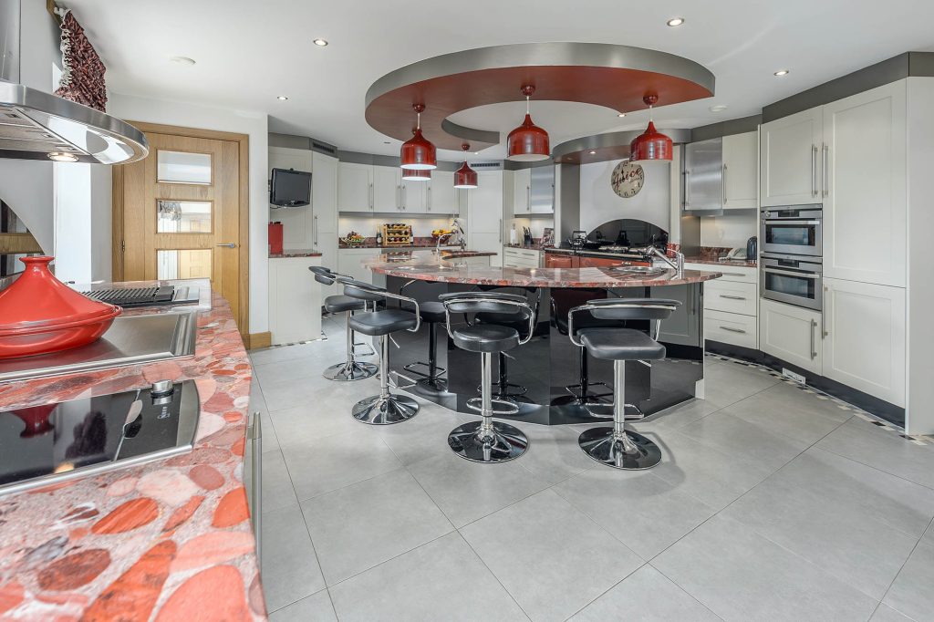 The first floor on the north side of the property offers two further bedrooms and a storeroom. Separately, to the south side, there is a first floor office. The fully fitted kitchen is particularly impressive with a central crescent shaped island deal for entertaining along with an Aga, sixring burner, hot plate/teppanyaki and many other modern features – perfect for a dinner party! Equally notable are the en-suite facilities, with the master bedroom especially standing out with its central jacuzzi bath, his and hers sinks and feature walk-in showers, giving the largest bedroom and bathroom a real sense of luxury.