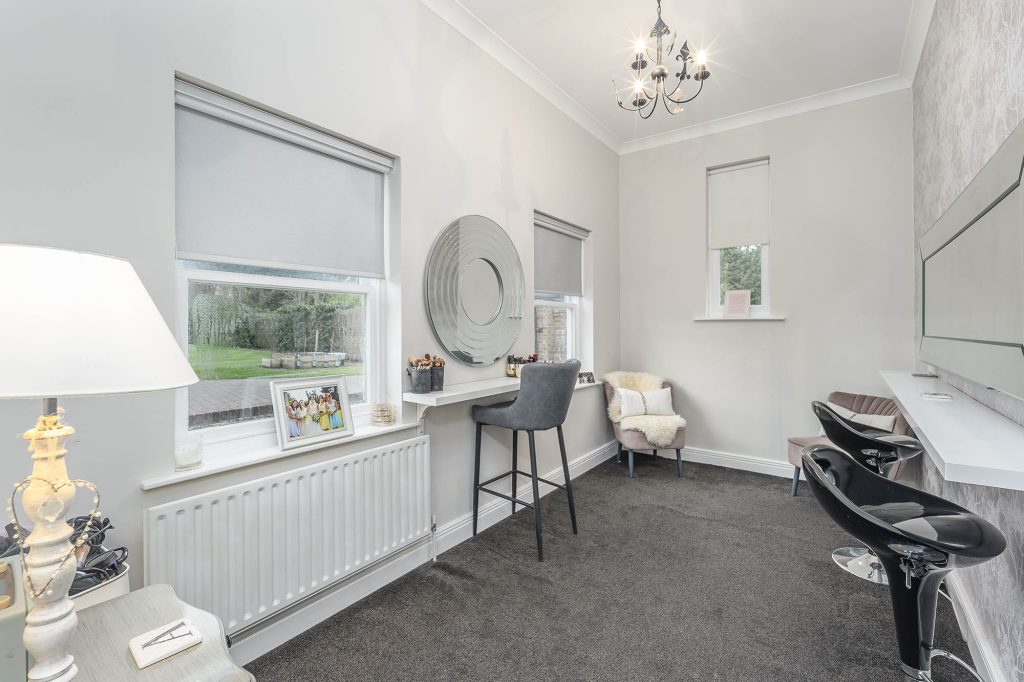 Bedroom five currently used as a beauty room features coving, carpets three windows providing views to the garden and driveway.