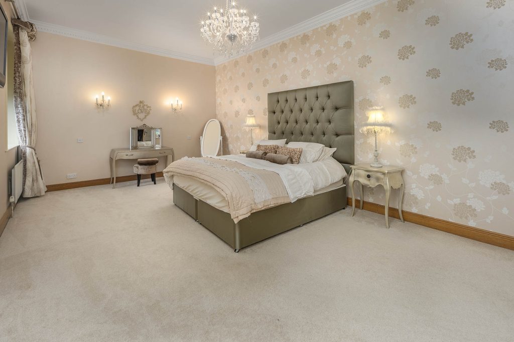Master bedroom features coving, two windows, carpets, and access to a large walk-in dressing room.
