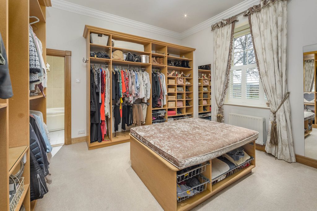 Walk-in dressing room features a window and is fitted with large wardrobes, shoe storage and shelving, door leading to the master en-suite.
