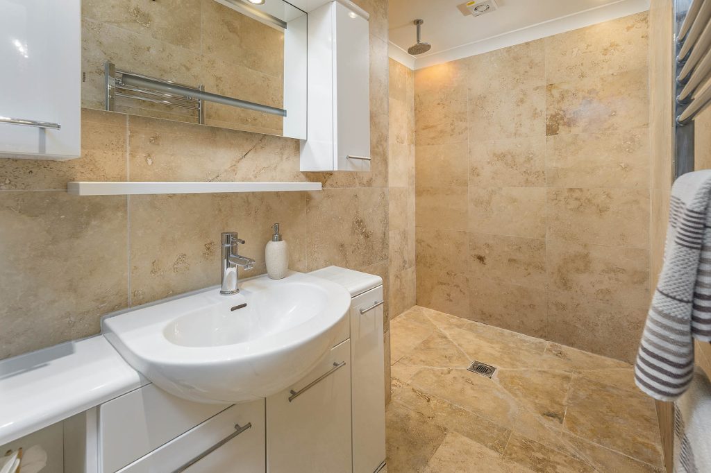 The luxurious Wet room with ‘travertine’ tiling to walls and floor, sunken lighting, fitted vanity sink, WC and chrome style towel rail.