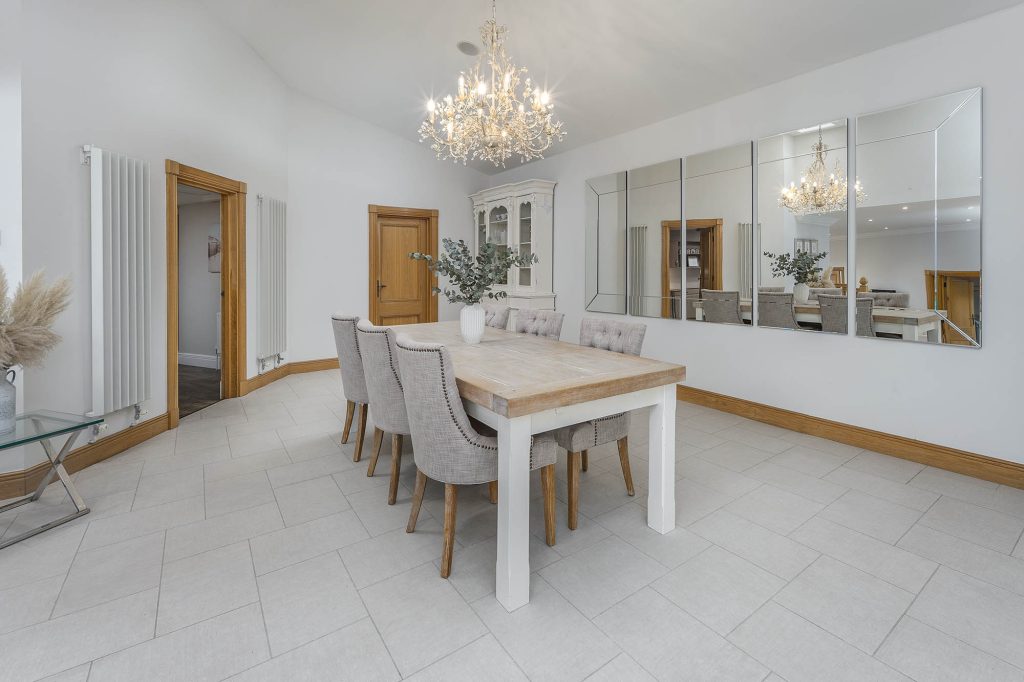 From the lounge via French Oak doors, you will enter the formal dining room, currently being used as a child’s playroom. An ideal room for a multitude of uses, being a snug or cinema room to name a few. With coving and three large windows. As well as volume control switch for the surround sound system.