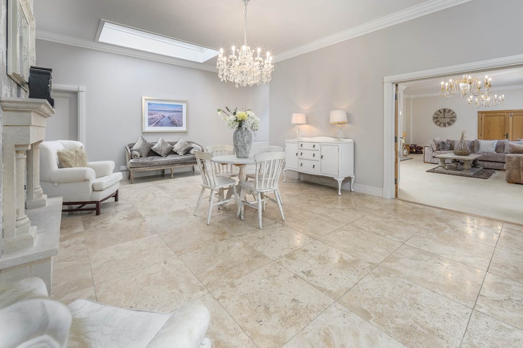 With several entrance points to the property, it is well placed to provide ease of access. The grand main entrance accessed via double solid, hardwood glazed doors, provides the wow factor with an abundance of light beaming in from the five skylights. Full marble flooring, gas fire with solid stone fire surround, also providing access to the lounge, cloakroom, bedrooms, and formal dining room.