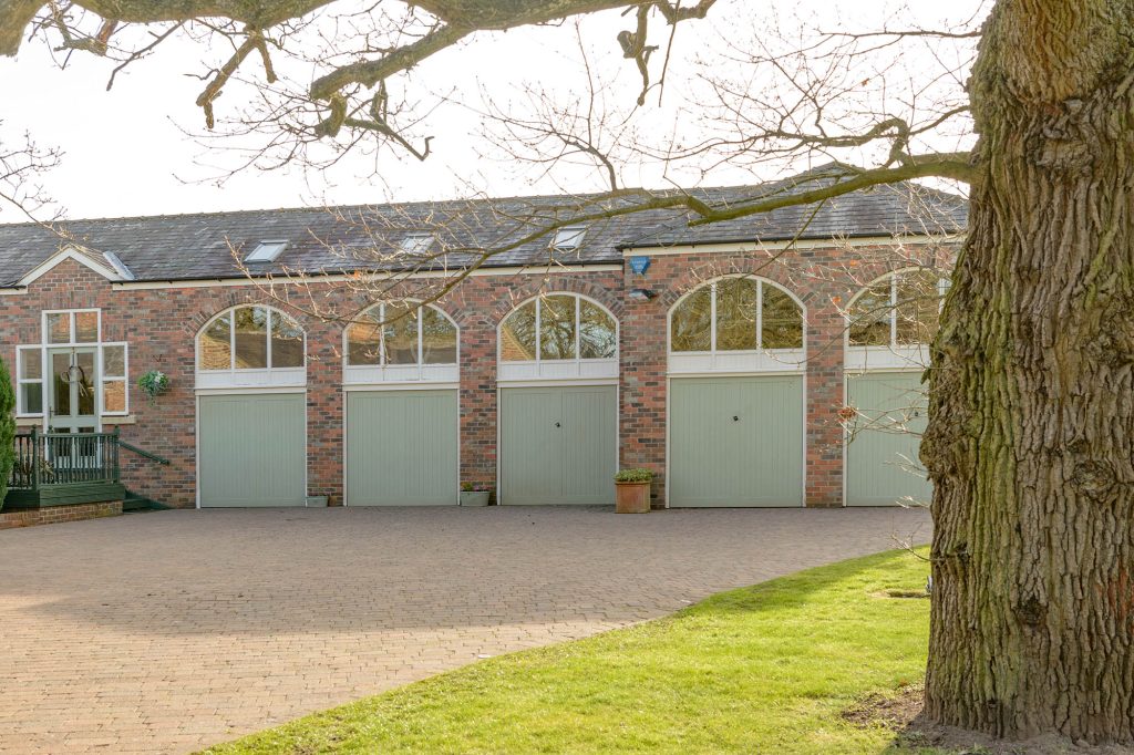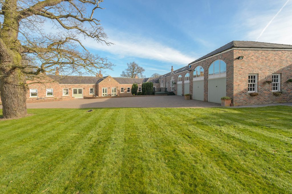 The property is accessed via a sweeping driveway, providing ample space for parking, courtyard gardens and five integral garages.