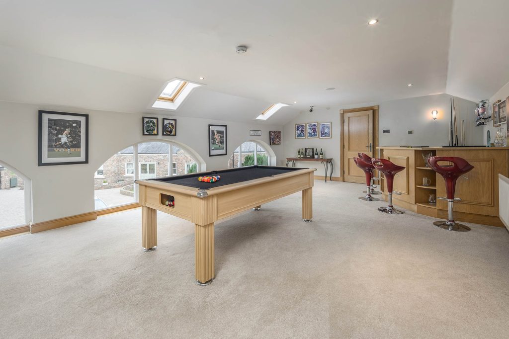 Games room features three Velux windows, and three church style double glazed windows, providing a fine view over the outdoor space. With a fitted oak bar, carpets, and TV point.