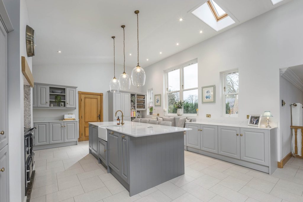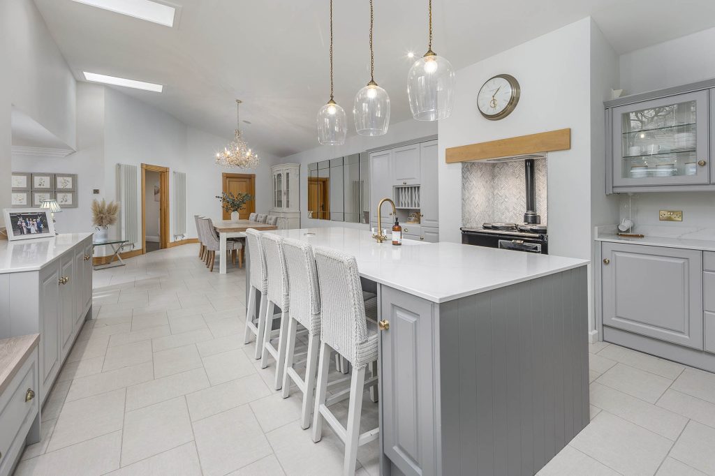 Leading into the hub of this property is the spectacular open plan Kitchen/breakfast area measuring over 37ft with an abundance of space and light being provided via three large windows with feature window seat and Velux windows and Kardean flooring. Recently refitted by the current owners, this Kitchen has everything for modern day living. At the heart of this fantastic kitchen is the island with three ‘Jim Lawrence’ pendant lights above, housing the dishwasher, Belfast sink, bin storage cupboard and an electric sunken electric socket unit with Wi-Fi connectivity, USB ports and plug sockets. Quartz worktops and a black limited-edition Aga really do give this Kitchen an impressive finish. With ample amount of wall and floor units, including an integrated fridge/freezer, pantry style storage unit and spice draw. Access to the utility room. The breakfast area leads to the small office, laundry room and large office space.